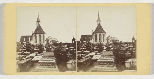 This is a stereoscopic card of Chester Cathedral - From Walls by Francis Bedford. The sepia tones and the composition create a somber yet intriguing visual experience. Bedford uses the stereoscopic format, with its slight variation between the two images, to enhance the depth and dimensionality of the scene, pulling the viewer into the space of the cathedral grounds. The structure of the cathedral itself—its imposing stone facade, the rhythmic repetition of arched windows, and the solid tower—dominates the composition. This architectural dominance can be read as a sign of the enduring power of institutions, both religious and social, in Victorian England. The graveyard in the foreground, filled with numerous headstones, adds a layer of contemplation on mortality. Bedford's photograph invites us to consider the interplay between permanence and transience, power and vulnerability, as visually expressed through the architectural and natural elements.