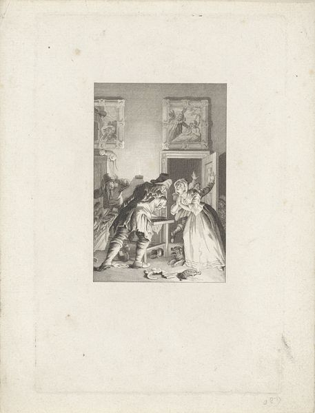 Reinier Vinkeles created this print, "Oudere man zegent een jong paar" (Older man blessing a young couple), in the Netherlands in the late 18th or early 19th century. It reflects the social emphasis on family and the ritualistic aspects of marriage during that time. The image depicts a formal interior where an older man, presumably a father or patriarch, is blessing a young couple by joining their hands. The act signifies the transfer of familial approval and perhaps even property or social status. It is staged in a domestic setting, possibly a parlor, which suggests the private yet ceremonious nature of such an event. The cultural norms of the Netherlands at this time valued social stability and the preservation of family honor, something very important in Dutch society. As historians, our understanding is enriched by researching the social customs and legal frameworks surrounding marriage in the Netherlands during this period. Archival documents, such as marriage contracts and family records, provide a deeper insight into the significance of this blessing and its place within the broader social and institutional context.