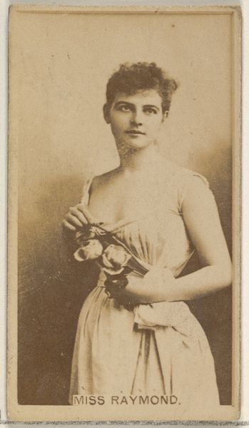 Editor: Here we have a promotional cigarette card featuring Anna O’Keefe, an actress, dating to sometime between 1890 and 1895. It's quite small, a delicate portrait almost sepia-toned. What stands out to you about this image, considering it was essentially an advertisement? Curator: Well, the fascinating thing is its context. These cards weren’t just about selling cigarettes; they were about selling a lifestyle, a connection to fame and beauty. Duke Cigarettes used these "Actor and Actresses" series to create desire, linking smoking to the glamorous world of the theatre. Do you see how Anna O'Keefe is presented? Editor: Yes, she looks quite poised, her gaze confident, almost inviting, and her presentation is clearly quite important to the message. Curator: Exactly! And consider the political implications. These cards circulated widely, shaping public perceptions of beauty and celebrity. The selection of actresses, their poses, their styling - it all reflects and reinforces specific social values of the time. The image of Anna O'Keefe on this card participated in a cultural dialogue, reinforcing ideas about women, fame, and consumerism. Do you think it matters that it was also consumed predominantly by men? Editor: It certainly adds another layer. I hadn't really considered how this tiny piece of advertising speaks to broader cultural trends of the time. I suppose it reveals how advertising became integral to social commentary and cultural values? Curator: Precisely. Something as seemingly trivial as a cigarette card can offer a window into the social and cultural landscape of a specific historical moment. It serves as a miniature, mass-produced piece of popular culture that played a surprisingly public role. Editor: This has been eye-opening; looking at this card I’d previously thought of it as mostly decorative, now I see it as such an artefact of its time.