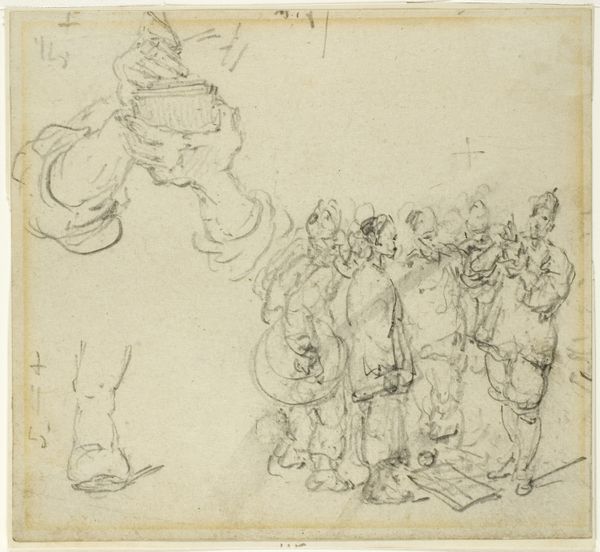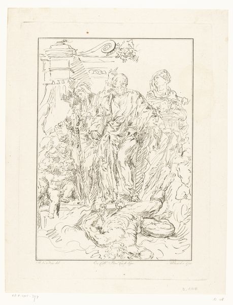 Giovanni Domenico Tiepolo created this pen and brown ink wash drawing, featuring two distinct scenes on a single sheet of paper. The upper scene depicts the martyrdom of St. Stephen, while the lower portrays Agrippina landing in Brindisi with the ashes of Germanicus. The composition is striking, with dynamic lines and a sense of movement achieved through the contrast of light and shadow. Tiepolo's masterful use of the ink wash creates depth and volume, while his expressive lines convey emotion and drama. The upper scene is crowded and chaotic and through its inverted placement destabilizes the conventional reading of the page. Tiepolo uses line and form to challenge fixed meanings by prompting a comparison between sacred martyrdom and classical narrative, inviting us to contemplate themes of sacrifice, honor, and remembrance. This highlights how his work destabilizes established meanings and engages with new ways of thinking about representation.