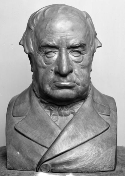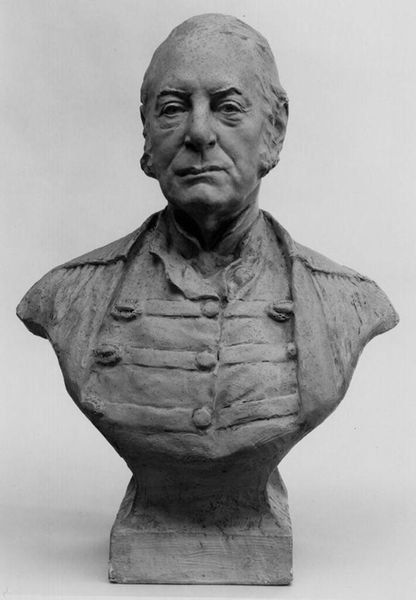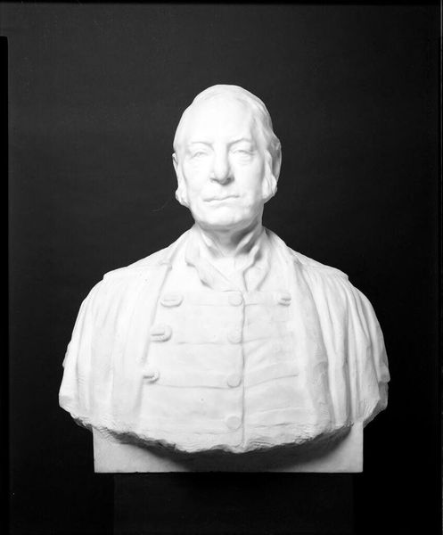 Editor: This is Bela Lyon Pratt's portrait bust of Henry Lee, created sometime between 1867 and 1917, at the Harvard Art Museums. The starkness of the monochrome draws me in. What do you see in this piece? Curator: The formal elements are quite striking. Consider the texture – the rough, unfinished quality of the stone contrasts with the smooth planes of the face. Do you observe how light interacts with these varying surfaces? Editor: I see that the light highlights the face, especially around the eyes and cheekbones. The coat appears flat, almost like a backdrop to emphasize the head. Curator: Precisely. The sculptor directs our gaze through manipulating light and shadow, using the sharp contrast to define form. It is a carefully orchestrated visual experience, wouldn't you agree? Editor: Definitely! Thinking about the interplay of texture and light changes how I see it. Thanks for pointing that out!