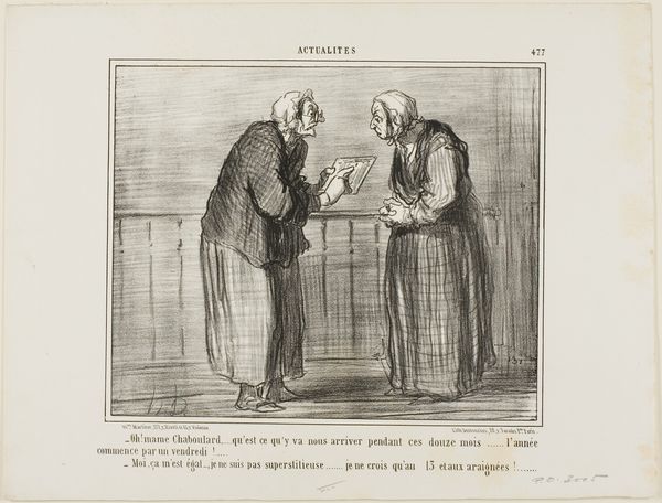 Editor: This is "Eh! Bien, comment trouvez-vous cela?" a lithograph drawing by Honoré Daumier, from the 19th century. It's... well, it's pretty unsettling. There’s something grotesque about the faces. What do you see in this piece? Curator: Beyond the immediate reaction to the characters’ appearances, this caricature presents a satirical critique of societal norms around consumption and class during that period. Daumier often used his art to comment on the bourgeoisie, right? Editor: Yes, I've read that. So, is the “rat” on the plate literal, or more of a symbolic…dish? Curator: Probably both. The title itself is a question, implying an absurd culinary offering. Consider how foodways have been, and continue to be, tied to identity and power. Serving rat could be a metaphor for what the elites feed the poor, perhaps, or how exotic tastes were being forced. Why would one eat Norwegian rat, precisely? The question carries with it an implication that there may be something other than gastronomic experience to be gained by it. Editor: So you're saying it might be a social commentary disguised as, or enhanced by, dark humor? Highlighting class differences or maybe anxieties about the "other"? Curator: Precisely. Daumier gives visual form to these complex dynamics, inviting us to question who benefits and who suffers under certain social arrangements. It’s also related to France’s evolving identity as a colonial power, with Norway functioning metonymically in the statement about rats from elsewhere being more tasty than the ‘home-grown’ kind. Editor: I see it so differently now, thinking about class and societal critique. It makes Daumier's work much richer, considering how something so seemingly simple can hold such weight. Curator: Indeed, his art compels us to critically engage with our own present-day structures of power, questioning how societal hierarchies continue to shape our perceptions and interactions.