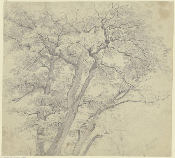 Curator: Heinrich Dreber created this pencil drawing, "A Stand of Trees," around 1840. The detail achieved with a relatively simple material is remarkable. Editor: Yes, it evokes such stillness. There's a delicate quality to the lines that almost makes it seem like the forest is holding its breath. What's your take on the composition? Curator: It is about close observation. Consider the paper itself—likely handmade with a degree of texture influencing the pencil’s movement. Then there’s the very visible application, stroke upon stroke building form and shadow; the artist foregrounds the labor involved, making the act of representation itself visible. We also see the beginnings of industrial forestry in Germany which began reshaping not only material resources but cultural views. Editor: I see the marks, certainly, but I am also compelled by the strategic use of light and shadow. The subtle gradations give shape to the trees and imply the soft diffusion of sunlight filtering through leaves. How each line interacts and contributes to the illusion of form interests me more. Curator: But can we ignore how this scene becomes romanticized? The individual encounter within this wood creates a powerful metaphor about German identity—consider the period, filled with social reforms, proto-industrial development, and new modes of travel which opened up both access and exploitation. Editor: Perhaps. However, looking at it as a formal exercise in tone and texture reveals how Dreber used the pencil to its fullest potential. There's a clear structural rhythm in the way he balances the darker, heavier trunks against the delicate, almost ethereal quality of the branches and foliage. I think this shows a deep understanding of composition beyond just romantic ideals. Curator: Of course, the pencil allows a unique level of detail readily available at an industrial scale, allowing art to emerge beyond academies as landscapes and picturesque views became popular commodities accessible beyond aristocratic consumers. Editor: Maybe. Still, the very act of slowing down to carefully render such minute detail creates, to me, an undeniably strong feeling of peace. The overall structure really draws one in, regardless of the socio-economic background! Curator: An astute observation that underscores both its inherent artistry and cultural meaning. Editor: Agreed. Let's move on.