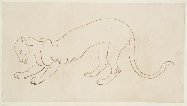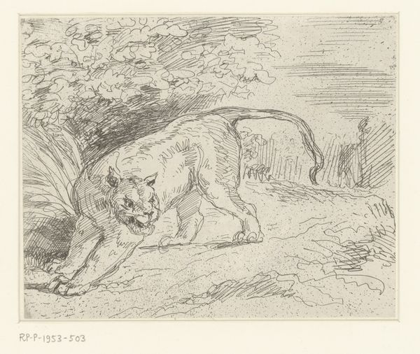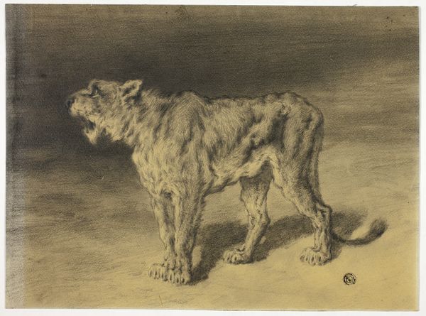 Curator: This drawing, executed in pencil, is entitled "En løve på en klippe. Den ser efter en forbiflyvende fugl," or "A Lion on a Rock, Watching a Bird Fly By." It was created in 1858 by H.W. Bissen. Editor: It's… surprisingly gentle, isn’t it? Despite the potentially dramatic subject. The light touch with the pencil, the relatively small scale, all contribute to this feeling. And that sweeping curve of the tail. It's almost playful. Curator: Indeed. But perhaps that's the very tension Bissen sought to create. Think of the lion as a symbol. For centuries, the lion has signified imperial power, specifically male virility, brute strength, and domination in Western culture. Here, we see him… distracted. Editor: You're right; the compositional focus feels almost off-kilter, asymmetrical. The cliff edge dominates, the bird a mere suggestion in the bottom left corner. The weight of the lion shifts forward, visually unstable. It's as if the artist is deliberately undermining a traditional representation. Curator: Exactly! Consider Bissen’s position at the time: Denmark experienced tremendous political and military setbacks, so through a contemporary lens, the image then might signify a challenge to deeply entrenched power structures. The lion's diminished stance, literally "looking away" from its expected dominance, invites critiques of existing authority and promotes consideration of alternate world orders. Editor: It also is beautiful as a study in light. Note how Bissen uses cross-hatching to define the volume of the cliff and the mane, almost sculpting with the pencil. Curator: Precisely, even within apparent visual gentleness, the image is pregnant with both personal introspection and socio-political observation. It transcends a mere visual representation, becoming an allegorical commentary relevant both then and now. Editor: So, ultimately, a tender, almost subversive moment captured with precision. Curator: Agreed, a fascinating blend of the observed and the imagined that compels continual scrutiny.