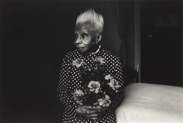 Curator: Marion Palfi's gelatin silver print, simply titled "Untitled," is part of her series "There Is No More Time," and features the wife of a lynch victim. Editor: The immediate impact is one of profound sorrow. The stark contrast emphasizes the gravity of her gaze, the angle perhaps a visual metaphor for injustice. Curator: Palfi’s photographic method, focusing on social issues, transforms the paper itself into evidence. The weight of the story resides not just in the image, but in the physical document. Editor: Indeed. The graininess almost feels like the grit of the Deep South itself, a texture hinting at the harsh realities faced by those living under Jim Crow laws. Curator: Note the careful composition. The framing and lighting draw our attention to her expression, a study in resilience and defiance. Editor: Looking closely, the print seems aged, a material reminder that such injustices are still within living memory. Curator: It's through this interplay of form and content that Palfi makes a statement, implicating us in a narrative of past and present. Editor: It leaves us to question not only the means of image production, but the ongoing cultural labor of seeing and remembering.