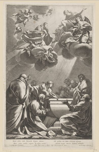 Editor: Here we have John Baptist Jackson's "Uitstorting van de Heilige Geest" or "The Descent of the Holy Spirit," an engraving from 1745 at the Rijksmuseum. It is primarily executed in line. What strikes me is how the strong vertical lines of light dominate the composition. What do you see in this piece? Curator: The linear perspective employed by Jackson creates a dynamic tension. Observe how the architectural elements—the arches, the receding floor—converge toward the radiant dove, effectively channeling the viewer's gaze. The artist manipulates space through precise rendering. Editor: It is all very well-structured, directing my attention, but what purpose do the Baroque and Line Styles offer here? Curator: These function in concert to amplify the drama inherent in the religious scene. Baroque conventions provide a vocabulary of expressive gestures and dramatic lighting which serve the formal structure provided by line. Consider the contrast between the detailed figures in the foreground and the abstracted light emanating from above. The dove motif is very striking and functions as the work's centerpiece. Editor: Yes, it feels like the image’s visual energy stems from that point. Curator: Precisely. Now, let us reflect on the interplay between form and content in the overall effect. Editor: I can certainly appreciate the ways line contributes to both defining the space and highlighting important aspects of the composition. Curator: Indeed, such visual architecture guides our eyes and provides much symbolic structure.