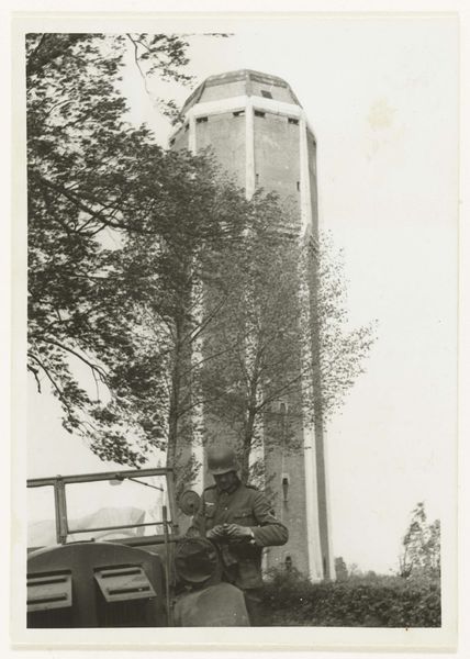 Curator: Dorothea Lange's photograph, taken in 1937, titled "Family of nine from near Fort Smith, Arkansas, on their way to find work in the California harvest, between Yuma and Phoenix, Arizona." It is a gelatin-silver print. Editor: It's intensely still, wouldn't you say? That monotone palette amplifies the dust and heat almost to the point of suffocation. There's an air of quiet desperation clinging to every element in the frame. Curator: Absolutely. The composition draws the eye immediately to the vintage gas pump – a towering symbol of both hope and obstacle, wouldn't you agree? Note its placement – a stark vertical counterpoint to the horizontal expanse of the parched landscape. Editor: Yes, that pump is undeniably striking. And the light hitting its metallic surface almost makes it appear saintly. It does provide some comfort but mostly serves to highlight the overall sense of deprivation. The vehicle's crammed with belongings, mirroring the occupants’ burdens and the scarcity of the resources available to them. Curator: Precisely. Lange understood how to orchestrate form to convey profound social commentary. The tight framing exacerbates the family's confined existence. The photograph makes us feel claustrophobic, even out there. It's masterful semiotic work using light, form, and composition. Editor: The starkness almost verges on caricature. Considering the Farm Security Administration's agenda during that era, how do you reconcile the authenticity of the moment captured against a possible orchestration for emotive purposes? I feel like their misery is being leveraged. Curator: The ethical quandary you raised regarding FSA photography continues to stimulate debate. Even though manipulations did occur, there's no escaping the sheer historical weight and resonance here. Look how she captures every man's facial expression! Each element contributes to the narrative of migrant lives during the Great Depression, and this resonates profoundly through the composition. Editor: Still, it gives you a heavy feeling that they were seen solely through the lens of social suffering... But, to give Lange her due, the formal clarity and deep tonal range makes this gelatin print more than just documentation; it’s almost monumental, an archetypal depiction of displaced people and uncertain prospects. Curator: I agree completely, a singular image that reveals how aesthetic precision and political vision are intertwined to achieve such resonance. Editor: Very true! One can easily interpret why Lange still captures audiences even today!