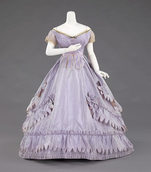 This ball gown was made by the House of Worth, a leading Parisian couture house. It beautifully illustrates how high fashion in the late 19th century was, in essence, a craft industry. The gown is constructed from delicate silk satin, likely woven on a Jacquard loom for complex patterns. The ethereal butterfly motifs are not printed, but meticulously embroidered by hand, a labor-intensive process requiring highly skilled artisans. These weren't considered artists in the traditional sense, but their expertise was essential to Worth's designs. Notice how the texture of the embroidery, the sheen of the satin, and the pastel palette all contribute to the dress’s light, airy quality. Worth was one of the first designers to brand himself, turning dressmaking into a recognized art form. Yet, this glamour rested on the invisible work of countless seamstresses. So, when we admire this gown's beauty, remember also the hands that brought it into being, and the complex social dynamics of the fashion world.