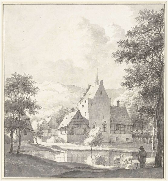 Curator: Welcome! Here we have “View of a Church Near l'Isle-Adam,” a work from 1819 by Louis Jules Frederic Villeneuve. It combines drawing, lithograph, and etching, showcasing a ruin amidst a humble village scene. Editor: It hits me like a fading memory – the crosshatching gives it such a spectral feel, doesn't it? Almost like peering into a ghost of a church. I get a definite sense of melancholy here. Curator: Indeed. This was a period captivated by Neoclassicism, with a particular fascination for ruins. Villeneuve, though lesser-known, positions the decaying church as a poignant reflection on time and change, hinting at institutional decline amidst the reshaping of Europe. Editor: Reshaping, eh? To me, it’s more of a personal echo of loss. I mean, look at the crumbling façade, the leaning headstones – it all speaks to the temporary nature of… everything. We build, we decay. And someone sketches it. Curator: Right, and the artist has positioned a grand, ornate column to the left. By doing so, Villeneuve subtly draws parallels to classical architecture, highlighting the church’s fall from grandeur and how that informs French identity after years of revolution and upheaval. The composition prompts questions about faith and history. Editor: Questioning is putting it mildly! I find myself just drawn to the texture. You can almost feel the grit of the stone, the way light struggles to penetrate through those overgrown trees. Makes you want to pull a weed or two, but also maybe not disturb a thing. You know, let the ghost be. Curator: Precisely that tension, I think, captures something important about historical art and how we interact with history more broadly. Does preservation enhance our understanding, or does it sterilize a deeper, perhaps more important message found in natural decline? Editor: That's the beautiful paradox, isn't it? To acknowledge decay as beautiful and potent... Anyway, what started as a church glimpsed through ink is actually an existential rumination with you, Historian! Thanks for pointing me in the right direction, or at least helping me appreciate the ruin in all its glory.