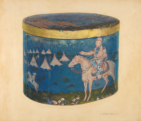Walter Doran made this *Bandbox* and we can see the charm of a maker who has a real grasp of craft. The colors are thin washes, which give a luminosity to the piece, and a real sense of light and atmosphere. The forms are very lively, and there's a feeling of animation, in the way the artist renders the figures and floral motifs. The scene on the box is really captivating. I keep coming back to the way the artist has handled the figures, there's a real sense of weight and volume. The way the colors are blended is really satisfying, it's so delicate and sensitive. The more I look at the image, the more I'm reminded of folk art. There's a simplicity and directness that makes it really appealing, and hints at a narrative or story embedded in the surface. It really embodies the playful and inventive spirit.