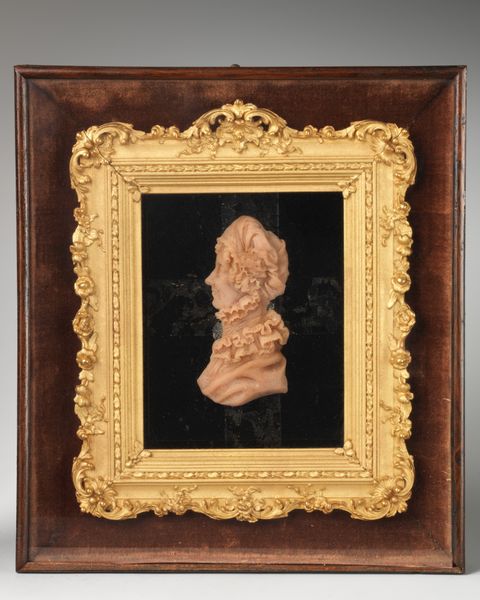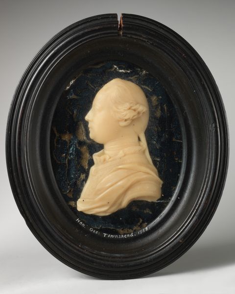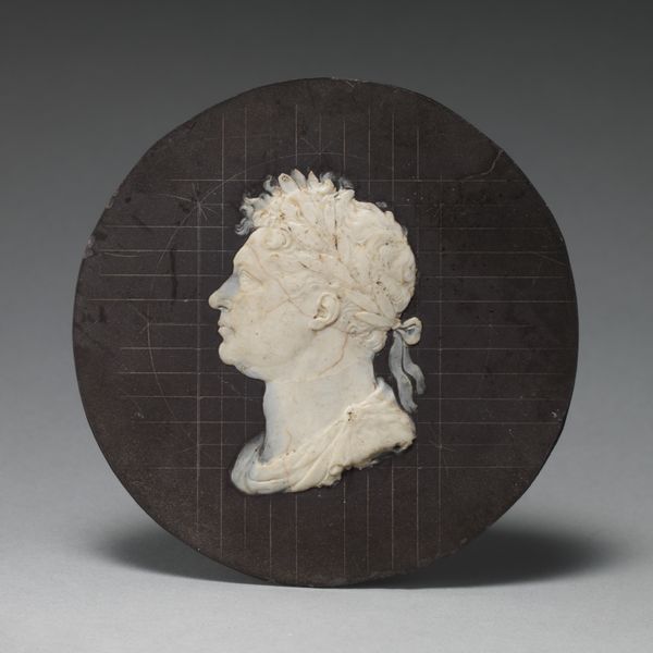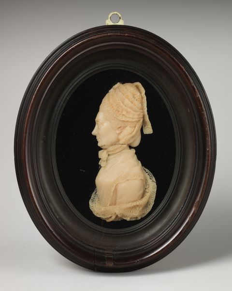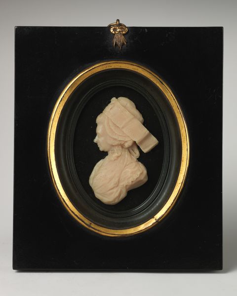 Curator: This exquisitely rendered portrait, “Miss Jane Gray,” was crafted in 1792 by James Tassie. Made with ceramic and glass, it resides within the collection of the Metropolitan Museum of Art. Editor: There's such a delicacy to it, almost as if she’s been sculpted from moonlight. A fragile yet captivating miniature world. Curator: Tassie truly was a master of Neoclassical cameos, wasn't he? Note how the stark white relief contrasts against that serene teal ground, creating an image of purity and perhaps even melancholic grace. Editor: Absolutely. And her profile is so clean, so refined—each detail meticulously placed, right down to the folds in her cap. But do you think the perfection of form almost mutes any sense of individual personality? She feels like an archetype. Curator: Perhaps, but that’s the language of Neoclassicism itself—to elevate the ideal over the individual, the universal over the particular. Consider the materials too. Tassie's mastery over glass and ceramic lends the artwork a timeless, almost ethereal quality, wouldn't you say? It removes her, poignantly, from our grasp, as a beautiful frozen artifact. Editor: Definitely. And the small scale adds to that sense of distance, like observing a moment snatched from another era. The eye is drawn to how this "decorative-art" summons something significant—something just beyond. Does "decorative" do it justice? Curator: A valid point. Sometimes labels obscure more than they reveal, right? I’d be happy just to bask in the glow and let those ideas jostle! Editor: A fitting reminder for all who try to hold the fleeting beauty in place, in museums and audio guides.