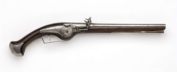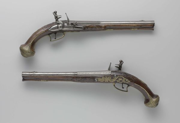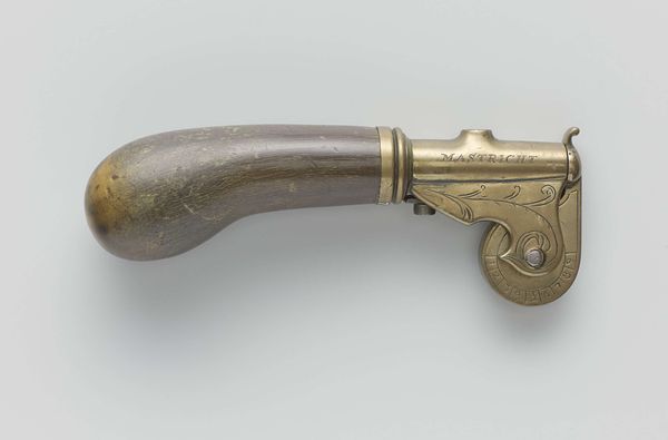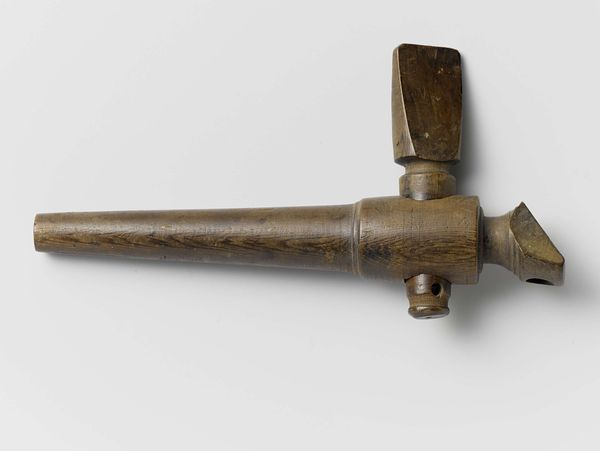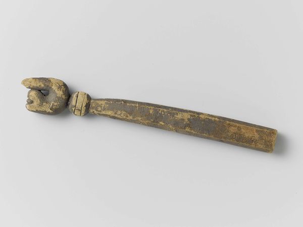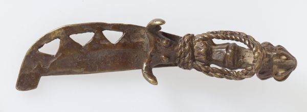 Editor: Here we have a brass goldweight, shaped like a dagger in its sheath, made by the Akan people sometime in the 19th or 20th century. It's surprisingly ornate, even given its small size. The handle and sheath are covered in these intricate geometric patterns. What catches your eye in this piece? Curator: Immediately, the interplay of form and texture is compelling. Note the rectangular structure of the sheath contrasting with the spherical and curvilinear handle. How does this juxtaposition influence our perception of the object? The repeated use of geometric patterns serves as a visual unifying device. The texture seems almost tactile. Editor: I hadn't thought about the contrast like that! It almost feels like two different objects fused together. How does the materiality of the brass contribute? Curator: The brass lends a certain gravitas, a sense of permanence and value. Its reflective properties allow the intricate details to catch the light, further emphasizing the craftsmanship. Note how the patination adds depth and character to the surface, aging the bronze and making the art. Do you consider that if this was gold, the form would be lost by the shine? Editor: Interesting point! It does seem like the imperfections enhance the form here. The play of light and shadow becomes more complex. This work really highlights the power of the form and medium over subject matter. Curator: Precisely. We've moved past a mere depiction of a dagger to understanding an exercise in visual language. Editor: This makes me rethink what constitutes meaningful art, as this piece has certainly transformed my perception of such items. Curator: I concur; analysing artworks based solely on their visual composition has enabled us to discover the intrinsic artistic merit in seemingly insignificant items.