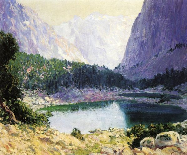 Curator: Edward Henry Potthast’s “Looking Across the Grand Canyon,” painted around 1910, offers a compelling glimpse into the early 20th-century fascination with the American landscape. Editor: Wow, I immediately feel this profound sense of depth and stillness. The air seems thick with the blue haze, doesn't it? You almost want to step right into the vista. Curator: Absolutely. This work aligns with the legacy of the Hudson River School in its depiction of nature as sublime, though Potthast adopts an Impressionistic style which diverges quite sharply. How do you perceive the interplay of light and color here? Editor: For me, it’s the unexpected hues—violets and blues painting the shadows—that really grab my attention. The warm, fiery oranges of the rock faces practically glow! It’s like a dreamscape painted with earthly pigments, wouldn't you agree? Curator: Interesting perspective. If we consider Potthast’s historical context, this focus on the aesthetic grandeur of the natural world reflects an emerging American identity, steeped in notions of westward expansion and resource extraction that carry, of course, quite different connotations today. The almost deliberate aestheticizing of these geological forms arguably sidesteps indigenous relationships to this terrain. Editor: Hmmm, I get your point, but art isn’t always obligated to be literal reportage. Maybe, and this is a big maybe, Potthast was simply trying to bottle some of the wonder and awe this place stirred in him, transferring it from his soul to the canvas. It feels more personal than political, you know? Like a love letter whispered in color. Curator: I see your point about the emotional tenor and aesthetic choices, and I won't push that perspective. However, I think recognizing those social-historical forces as having influenced this and other similar art from this period is valuable in encouraging a deeper understanding of the artist, the art and, just as importantly, the values of the audience admiring the work at that moment. Editor: Food for thought, definitely. So next time I wander the Canyon’s rim, I'll remember Potthast and consider the complex lens of history, and feeling, through which he framed it. It changes things! Curator: Precisely. Engaging art history and socio-political awareness to open richer conversations: this approach enhances our perspectives toward a fuller more rewarding appreciation.