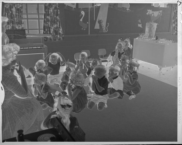 Curator: Here we have an intriguing photograph, simply titled "Untitled (family with four young children posed sitting in living room)" by Martin Schweig, part of the Harvard Art Museums collection. Editor: The immediate impression is almost ghostly, isn't it? The stark contrast and reversed tones give the scene a dreamlike, slightly unsettling quality. Curator: Indeed. The photographic process itself is central here. Notice how the reversed tones draw attention to the materiality of the image. What kind of film was used, and how did that impact the final print? These are vital questions. Editor: But consider the symbolism! A family portrait, traditionally a symbol of unity and stability, is rendered here in a state of almost eerie imbalance. What does this inversion suggest about the artist's view of family or domestic life? Curator: I’m more interested in the socio-economic context. What kind of labour went into maintaining this home, this family? The objects within the image are signifiers of mid-century domestic consumption. Editor: I suppose it's this dance between the familiar and the uncanny that truly holds my attention. Curator: For me, it’s how an everyday scene is made strange through manipulation of the photographic process.