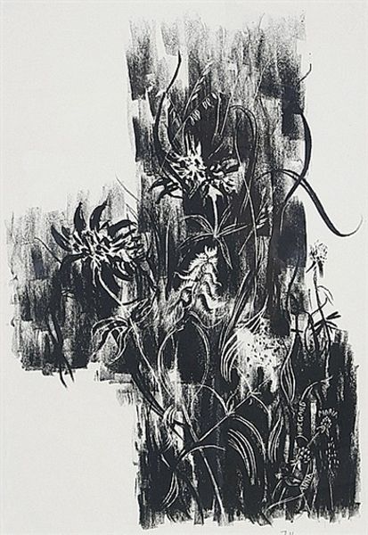 Adja Yunkers made this Untitled piece; it's a world of black and white, built up with an almost frenetic energy. The marks are so immediate, like a snapshot of a thought in motion. There's this one area on the left, a sort of skull-like form emerges from the dark splatters. It's not precise, but suggested, a ghost in the machine. The paint isn't just applied, it’s almost thrown, dripped, coaxed. You can almost feel the artist's hand moving, responding to the ebbs and flows of the material. Yunkers reminds me of Gorky in his ability to wrestle feeling from abstraction, the sense of something just beyond reach. What I love about abstract art is its ability to invite you into a space of questions, without demanding an answer.