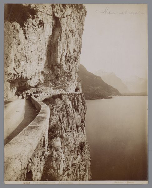 This photochrom print, "Tunnel op de Axenstrasse te Zwitserland", was created by Photochrom Zürich. The image is composed around the contrast between the rough, enclosing tunnel and the expansive, brightly lit landscape it frames. Notice how the tunnel's dark, earthy tones and coarse texture draw you in, while the vista beyond, with its soft blues and greens, invites a sense of freedom. The very structure of the tunnel acts as a visual device, almost a stage, directing our gaze outward. The figures within the tunnel, dwarfed by their surroundings, accentuate the sublime scale of nature. Here, the photograph plays with semiotic codes of enclosure and openness, security and exploration. The tunnel can be seen as representing a physical and psychological transition, pushing viewers from one state to another. The print's octagonal shape further isolates this scene, enhancing its quality as a captured moment. This interplay of form and content encourages us to consider not only what we see, but how we see, and how we interpret our relationship with the natural world.