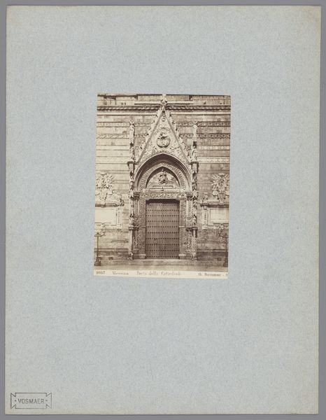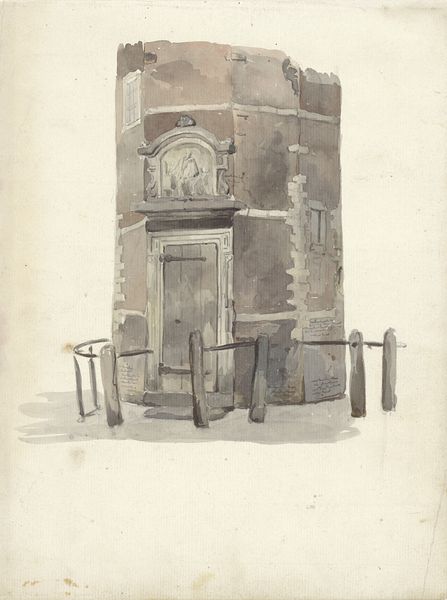 Editor: Thomas Shotter Boys' "Picturesque Architecture in Paris, Ghent, Antwerp, Touen, etc." from 1839, rendered in lithograph and watercolor, presents an enigmatic façade. It feels like a fragment frozen in time. The ornate doorway set against what appears to be advertising… It is an unusual pairing! How do you interpret this work? Curator: The layering of cultural and commercial symbols is very evocative. Consider the "Rue de la Lachine" inscription juxtaposed with the bold declaration of "Picturesque Architecture." "Picturesque" itself became a cultural commodity in the 19th century, a way of seeing and consuming the past. Notice how the architectural details – the gothic-inspired carvings framing the doorway – act as emblems of a romanticized, perhaps imagined, history. Editor: So, the artist isn't just depicting a building; he's commenting on how we package and sell history? Curator: Precisely! The artist draws our eye to the entrance and uses that element to hint at this tension between preservation and commercialisation. What memories or emotional responses are evoked by these architectural "picturesque" scenes, especially in relation to a rapidly changing urban environment? Consider what the image might be saying about our relationship with authenticity, as urban landscapes and architecture face commodification in an industrialised world. Editor: It’s like the artist is already questioning how we'll remember these places, even as he's documenting them. That the gothic elements can have dual meanings – beauty and historical reference. Curator: Exactly. The use of those very symbols can bring emotional impact. A symbol's weight relies upon context, a cultural understanding that evolves and reshapes its meaning, like language itself. The image creates dialogue across generations, offering reflection on value systems, aesthetic concepts, and perceptions of identity through material space. Editor: I didn’t expect such depth from what seemed like just an architectural study! Curator: It is amazing what you can discover by just looking.