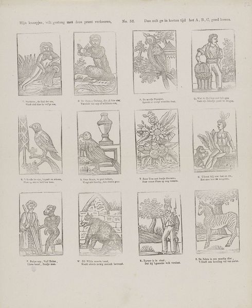 This lithograph by George Lodewijk Funke, titled "Het paardespel," presents a series of equestrian scenes. These playful images echo a long tradition of equestrian performance, a motif rooted in displays of power and skill. Note the figure wielding a sword while standing atop a horse. This recalls classical images of military prowess and dominance. Consider the Roman equestrian statues, where the horse symbolized not just transport, but imperial control. The figure's control over the animal mirrors a leader's control over his domain. Yet here, the context shifts. Instead of a battlefield, we see a circus, a space of entertainment. This reflects a metamorphosis in the symbol's meaning. The raw power of the horse is tamed, domesticated, and transformed into spectacle. The collective memory of the horse, once a symbol of war, now evokes delight. We see the cyclical progression of symbols, how they resurface, evolve, and take on new meanings.