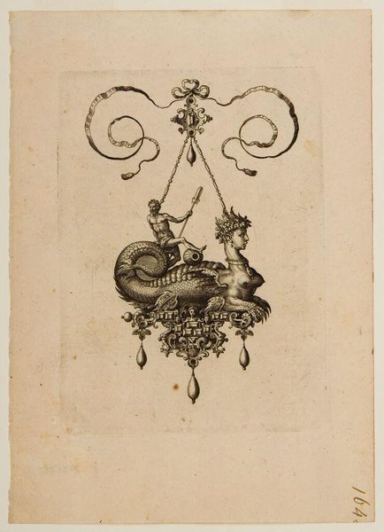 Adriaen Collaert created this pendant design with a sphinx, fish body, and oarsman as an engraving sometime between 1580 and 1618. The fantastic hybrid creatures and elaborate ornamentation, a revival of classical forms, speak to the visual language of the Northern Renaissance. This print provides a glimpse into the cultural values of the 16th and 17th centuries, particularly in the Netherlands. The prominent display of wealth and status speaks to the rise of mercantile capitalism in this region. Luxury goods, like the pendant, were increasingly in demand, and prints like this one served as both inspiration and advertisement for skilled artisans. The cultural fascination with mythology is also evident. The sphinx, a figure from Greek and Egyptian lore, reflects the interest of the period in classical antiquity. It's important to remember that art like this reflects the tastes of a specific social class and reinforces its power. To fully understand this image, scholars research the history of decorative arts, the rise of mercantile culture, and the influence of classical imagery during the Renaissance.