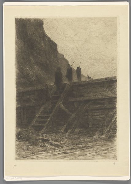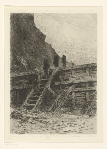 Carel Nicolaas Storm van 's-Gravesande made this etching, ‘Returning Fishermen,’ capturing a group of figures descending a wooden structure, their spears suggesting a day’s labor. The descent motif echoes through art history, resonating with images of the Fall, or of figures returning from sacred or transformative experiences. Notice how the figures’ bent postures and weary steps mirror the universal experience of returning to the everyday after a period of intense activity. This descent is not merely physical; it’s a symbolic passage back to the mundane, weighed down with the day’s experiences. Consider the spears, their pointed ends cutting through space. Similar weapons appear in ancient depictions of hunters, and warriors. These are symbols of survival and conflict, but here they represent a more personal struggle—the daily battle against the elements, the constant effort to provide, the relentless cycle of labor. The image is sparse, yet charged with the psychological weight of human endurance, a recurring theme in our collective memory.