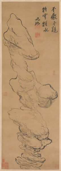 This is Hotei by Katsushika Hokusai, made using ink on paper. The artwork strikes us with its balance between simplicity and expressiveness, capturing the essence of the Zen Buddhist figure through minimal, fluid brushstrokes. The composition centers on Hotei, depicted with swift, confident lines that define his form. There is a visual rhythm to how the dark ink creates depth and volume. Notice how Hokusai skillfully employs the negative space surrounding Hotei, which gives the artwork an airy and contemplative quality. This interplay is not merely aesthetic; it embodies the philosophical underpinnings of Zen, emphasizing emptiness as a form of fullness. The strokes challenge traditional representational modes, where line, form, and texture invite us to contemplate the nature of perception. In deconstructing conventional forms of representation, Hokusai pushes viewers to engage with the artwork on a deeper level, seeing beyond the surface to grasp the underlying essence.