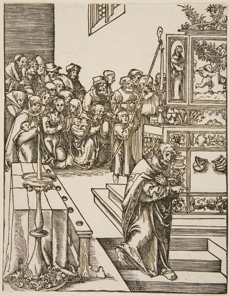 Editor: This woodcut, "Christ Asked to Identify Himself" by Ambrosius Holbein, shows a scene packed with figures. I'm curious about the production of this print. What can we infer about the making process and its socio-economic context? Curator: The labor involved in creating this woodcut is significant. Think about the artisans required to produce the paper, the tools, and the ink, and the skill required to carve the block, which would have been reversed, line by line. What does this level of material and human investment suggest about the intended audience and the function of such prints at the time? Editor: It’s interesting to consider how this would have been reproduced and disseminated. It makes you think about who had access to this imagery, and how they might have understood its meaning. Curator: Precisely. By examining the materials and labor, we begin to understand the artwork's role within the economic and social networks of its time.