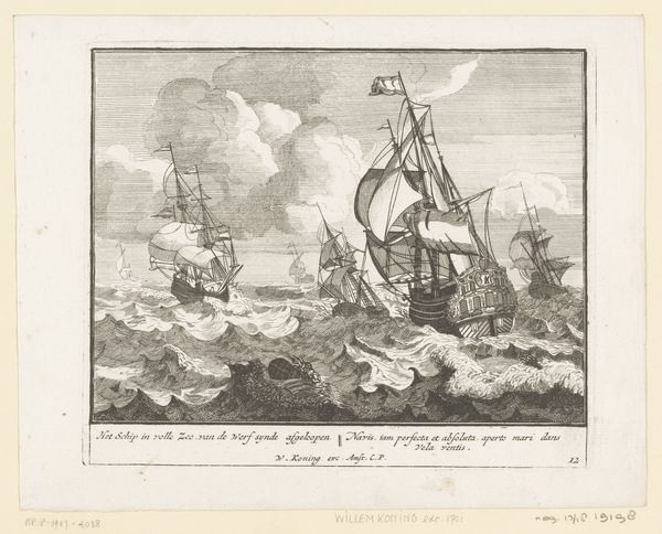Pieter van den Berge created this print of a storm-stricken ship on the beach. The composition is immediately striking with its contrasting registers. Note how the upper portion of the work is dominated by turbulent, swirling cloud formations. These clouds, rendered with dense, chaotic lines, create a sense of atmospheric pressure, while below, the wrecked ship lays at an oblique angle, disrupting any sense of balance. Consider the interplay between the detailed rendering of the ship and the more abstracted representation of the natural elements. The ship, though damaged, still retains a sense of structure. This is sharply contrasted with the formlessness of the storm. This interplay destabilizes any clear distinction between man's creation and nature's power. The artist challenges any fixed interpretation, inviting us to reflect on the unstable relationship between order and chaos, structure and collapse. It is a reminder of how artistic representation engages with broader cultural anxieties about nature and human experience.