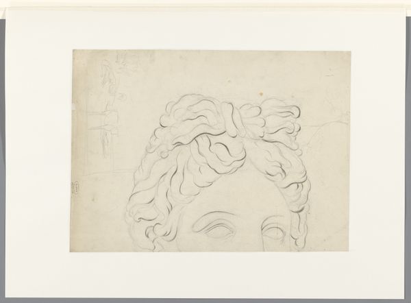 Curator: Looking at Eva Noe’s "Headdress," made around 1937 with pencil on paper, I’m immediately struck by its delicate and ghostly quality. It feels like a whisper of another era. Editor: A whisper is right. This simple head covering seems almost a symbol of repression, a visual encoding of prescribed gender roles and the obscured face of female identity. Curator: Huh, I saw something quite different; it sparks my curiosity with its incomplete face. It reminds me of a sketch from an atelier. Noe's work radiates with the intimacy of observing a figure in her personal world, don’t you agree? Editor: Well, let's remember that even seemingly simple sketches were very rarely without the underpinnings of social positioning and power dynamics at play. I see not only an intimacy, but potentially a suffocating, restrictive element to its softness. After all, who was the garment intended for, and what would have been the garment’s intended purpose? Curator: Now you’re reminding me of art’s potential to transcend the quotidian to touch on bigger emotional stuff. Perhaps Noe herself also sensed something like a melancholy undertone through the materiality. What I adore is how an unassuming pencil drawing allows us to spin wildly different narrative universes around itself. Editor: Right, but consider also Noe’s likely context as a woman artist. To render women's garments and not a female body raises fascinating questions. What stories might be suggested? Absence versus presence is powerful in art and resistance. What we may deem beautiful, perhaps is also born out of struggle. Curator: Okay, I hear that! Maybe in looking for answers, one finds a whole garden of unexpected questions instead. That's what I will cherish about the experience, thinking with the garment itself. Editor: For me, the piece becomes less about pure aesthetics and more about engaging critically with both what is shown, but most essentially, what is NOT revealed and instead remains invisible. It demands awareness of social implications tied to identity and historical legacy.