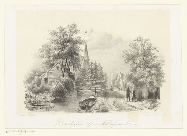 Curator: Johan Diderik Cornelis Veltens’ "Gezicht op Kortenhoef," dating from between 1824 and 1874, presents us with a captivating Dutch cityscape rendered in pencil. Editor: Ah, the delicate stillness of it! I’m struck by the quiet beauty, that feeling of almost suspended time that hangs over the whole scene, especially considering it's only pencil. It whispers of Romanticism, doesn’t it? Curator: Absolutely, you can definitely sense that Romantic era longing for an idealized past through his treatment of the buildings and church spire in the background, those features of a small rural community that feel connected to nature and God. Notice, too, how Veltens uses those symbols to convey traditional Dutch values and cultural identity. Editor: I see that connection to God, especially in how that church steeple just pierces the sky; it’s almost calling to heaven, but I see something slightly ominous about it. Almost like its keeping watch over the town. Also that little stick figure of a man, heading away. Is that an invitation or a warning? I suppose it depends on what's coming towards me versus where I've been. Curator: That figure, alongside the chickens pecking in the foreground, lends the landscape a touch of everyday reality but more broadly reflects a symbolic representation of agrarian life and pastoral innocence. Editor: Oh yes. And all that texture! You really get a sense of the brick on that left-most building, almost the opposite of the feathery treatment of those wonderful trees on the right. They give so much character and dynamism. It makes me think of our internal worlds and memories, they aren't one unified experience. We hold things that feel different. We hold complexities and nuance within our individual memories. Veltens creates an intimate portal through very precise artistic decisions. Curator: That’s a beautiful way to frame it, capturing its evocative power through contrasting memories of life. He wasn’t simply depicting a place, but a feeling about that place. Editor: Precisely. A place where reality blends so softly and gently with reflection. A wonderful paradox, it makes me want to wander.