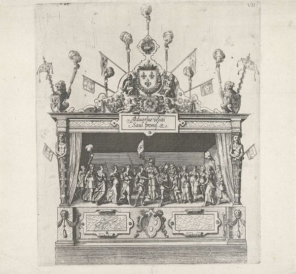Curator: Pieter van Call's engraving, "Fireworks at the Celebration of the Peace of Utrecht in Leeuwarden, 1713," currently residing at the Rijksmuseum, presents an intriguing scene. Editor: My first impression is that this is an impressive feat of perspective, creating an artificial vista in monochrome! Curator: Indeed! Observe the deliberate compositional structuring; the centralized temple motif and the strong horizontal and vertical lines work together to establish depth, pulling the eye toward the fireworks display at the vanishing point. The density of linework really gives depth to the smoke. Editor: And those fireworks – they seem almost celebratory in their extravagance! Visually, fireworks commemorate significant events but have you considered them to act as symbols of ephemerality, moments of great release quickly disappearing, underlining both the power and fragility of peace itself. Curator: That’s a potent interpretation. I'm struck by the repetition of forms and the structured chaos created by the fireworks within that ordered framework. It's visually stimulating, yet remains anchored by architectural elements. This interplay underscores the work's dynamism. Editor: Moreover, if you consider Baroque sensibilities, everything is symbolic. What appears on first glance to be decorative carries coded cultural meanings accessible to the contemporary viewer, a language expressed visually for posterity. The structure framing a goddess statue for instance acts as an allegory to Peace, Reason or Justice triumphant after long conflict. Curator: The symbolic language of Baroque art indeed aimed at clear articulation; however, the lasting intrigue of the artwork arises precisely from the tension generated through structural and technical oppositions in monochrome. It also appears to represent modernity. Editor: I think that's a valid, alternative opinion. Overall this print seems to be charged with multiple levels of interpretation and provides viewers with layers of understanding relevant in our age of information overload. Curator: Absolutely, thank you! A stimulating analysis and further perspective on Van Call’s vision in celebration, construction, and lasting artistic intention.