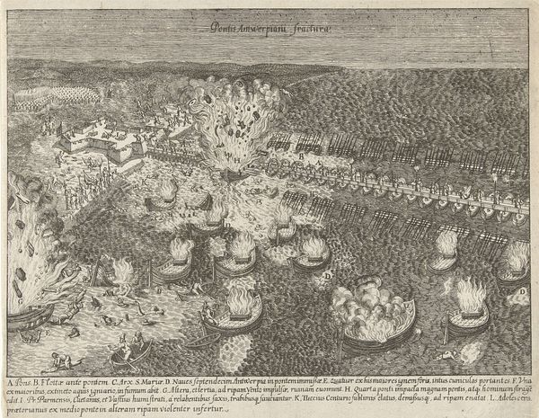 Curator: This compelling print by Coenraet Decker depicts “The Explosion of the Ship Bridge on the Scheldt, 1585.” Dating from the late 17th or early 18th century, it's a detailed etching showcasing a pivotal moment in the Siege of Antwerp. What's your immediate reaction? Editor: The overwhelming chaos! It's a scene of complete destruction; the ships ablaze, the bridge ruptured, figures flailing in the water... It’s a powerful image, though quite graphic. The materials, this painstaking printmaking—seems a sharp contrast to the destructive event itself. Curator: Precisely. Decker renders violence with meticulous line work, drawing attention to the socio-political turmoil. This image encapsulates the religious conflicts and power struggles during the Eighty Years' War. We see this event mirrored through a baroque lens, emphasizing grand historical narratives. Editor: It makes me consider the labor behind the piece – the making of the print itself. How the tools, inks, and paper—and of course, Decker’s skill — are complicit in presenting a specific version of events, particularly considering that the print was created nearly a century after the event! What was the context of its production and consumption? Curator: Excellent question! Prints like this were vital tools for disseminating information, albeit biased, of significant events. They were reproduced and widely circulated. Analyzing it now, it becomes clear the ways this image can speak to cultural anxieties about power, resistance, and perhaps even the trauma of warfare. The victims are almost abstracted by the detail. Editor: I'm particularly struck by the artist's process and his raw materials – how etching captures something of the real violence while creating commodity for the burgeoning print market. It provokes a further look into labor involved in creating such pieces. Who were the printers? How were these prints distributed, sold, and used to spread ideology? Curator: These questions are vital to understanding the complexities inherent in this piece and the narratives it perpetuates. Understanding that art doesn't exist in a vacuum is so important. It's influenced, intentional, and tells stories both overt and subtle. Editor: Absolutely. Appreciating not just the "what," but the "how" and "why" it came into being sheds light on history as it unfolded. Curator: Exactly! Thanks for exploring with me. Editor: Likewise! These explorations always expand our understanding, materially and beyond.