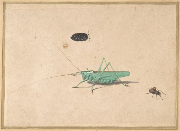 Joris Hoefnagel created this watercolor and gouache painting of four grasshoppers on vellum during a time when naturalism was flourishing in art and science. The artwork provides a glimpse into the artist's world. As a court artist, Hoefnagel was influenced by the scientific curiosity of the Renaissance era, which propelled a movement towards detailed observation and documentation of the natural world. Each grasshopper, rendered in distinct colors and meticulous detail, reflects an appreciation for the diversity of life. There's a beauty in how Hoefnagel captures the individuality of each insect. It is as if they are portraits. Consider this work not just as a scientific study but also as a reflection of Hoefnagel's personal connection to the world around him.