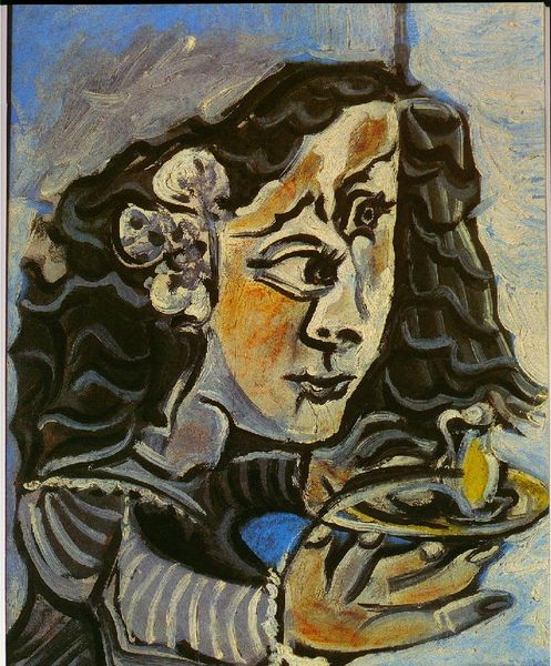 Cricorps made this work, entitled 'Corbo et Renard', with paint on canvas. The artist uses the basic materials of oil paint in a rather unusual way. Notice how the paint is applied in a web of interlocking shapes, creating the forms through networks of lines. The artist seems more interested in form than color. The approach, with its emphasis on outlines, has an affinity with stained glass, but also perhaps with printed material. The artist seems to be asking a question: how little is needed to produce an image? This is a question that touches on much wider issues of production and labor. Here, the artist seems to be embracing efficiency, almost as if on an assembly line. By emphasizing the means of production – the bare minimum required – Cricorps encourages us to think about the relationship between artistic practice and other kinds of work.