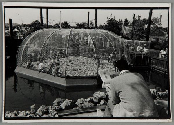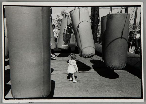 Curator: Bill Dane’s "Untitled (Marine World)" captures a scene with a child reaching for a balloon. It is currently held in the Harvard Art Museums. It is a gelatin silver print. Editor: The immediate impression is one of stark light and shadow, a document of transient joy amidst the everyday. It almost feels suspended in time. Curator: Exactly. Dane often explores the performative aspects of public life and the unspoken narratives embedded in seemingly candid moments. The balloons themselves could represent fleeting aspirations, access, or perhaps even childhood innocence. Editor: And consider the materiality - the gelatin silver print, a process deeply rooted in photographic history, transforming a moment into a tangible, lasting object. The labor invested in the photographic process itself contrasts with the balloon's ephemeral nature. Curator: I think you're right. Thinking about the social context, Dane often captured these everyday scenes as a way to comment on social dynamics and class differences. It makes me wonder who has access to joy. Editor: It certainly provides much to consider about production and consumption, offering us a glimpse into both the fleeting and the lasting. Curator: This photograph invites us to reflect on the power dynamics at play in public spaces, and the stories we often overlook.