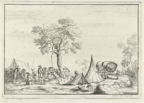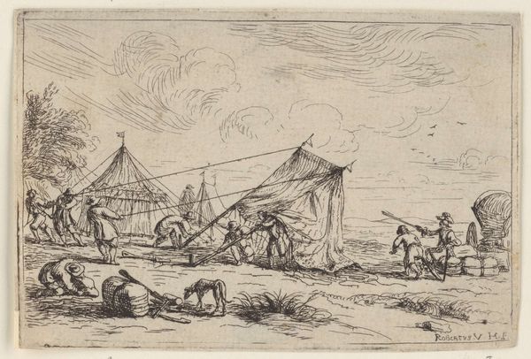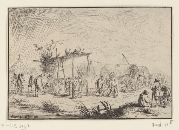 Editor: So, this is "Soldaten bij een kampement," or "Soldiers at a Camp," by Robert van den Hoecke, dating from somewhere between 1632 and 1668. It's an etching in ink, and what strikes me is how the loose, almost hurried lines create such a detailed depiction of everyday military life. What aspects stand out to you when you look at this? Curator: Immediately, I'm drawn to the labor embedded in this "everyday military life." Look at the materiality of the tents, roughly constructed. Notice how the figures aren’t romanticized heroes, but men caught in the act of building and maintaining their infrastructure. It begs the question: What kind of societal demands produced such scenes, reproduced here as etching? What purpose does such ‘genre painting’ fulfill? Editor: That's a really interesting way to look at it. I was focused on the almost documentary feel, but your point about the labor involved, and how the etching itself is a product of labor... it really shifts the focus. Do you think the medium, etching, lends itself to this sort of material analysis? Curator: Absolutely. Etching, unlike, say, oil painting commissioned by nobility, allows for relatively mass production and dissemination. This in turn widens the viewing public for an artwork that shows something more along the lines of, shall we say, working conditions on campaign. It becomes a commodity illustrating labor. How do you see that interplay manifesting? Editor: Well, I hadn't considered the socioeconomic aspect of etching itself. It's fascinating to think about how the material accessibility of the medium might have influenced the choice to depict these working soldiers, and its consumption by different social strata. Curator: Exactly! Considering production and audience allows a more insightful grasp of the artwork, far beyond simplistic reading of visual aesthetics and individual skill of an artist, and the values of its social milieu come through all the clearer. Editor: This has completely changed how I view the piece. I'll definitely be paying closer attention to the materials and processes in other works we'll be discussing.