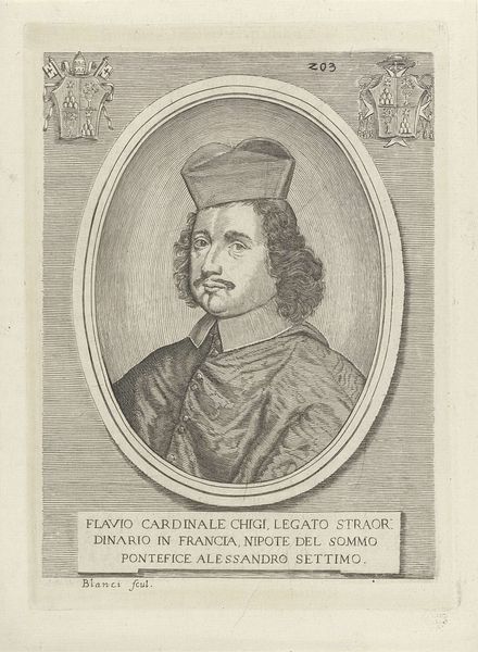This print, titled “Titel en 1 prent van een reeks bouwvallen” was made by Jean Laurent Legeay, in the 18th century. Immediately, the oval composition draws our attention to the portrait set within it. Notice the concentric lines that form the backdrop, creating an almost hypnotic effect that highlights the Cardinal's face. The artist uses line work meticulously to define form and texture. The subject's robes, his hair, and even the subtle shadows on his face are rendered through dense, controlled strokes. This technique not only provides detail but also introduces a sense of depth and volume. The image is also framed by heraldic crests in the top corners. Structurally, the print employs a series of contrasts, using the smoothness of the oval to set off the angular forms of the cardinal's hat. Legeay sets up a visual semiotic system, where each element —from the hat, the robes, the crests— acts as a signifier of power, status, and ecclesiastical authority. This invites viewers to unpack the cultural codes and hierarchies embedded within the artwork.
