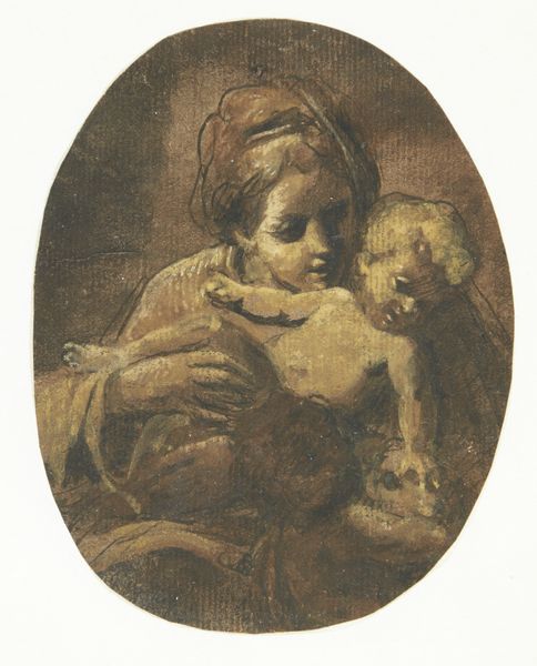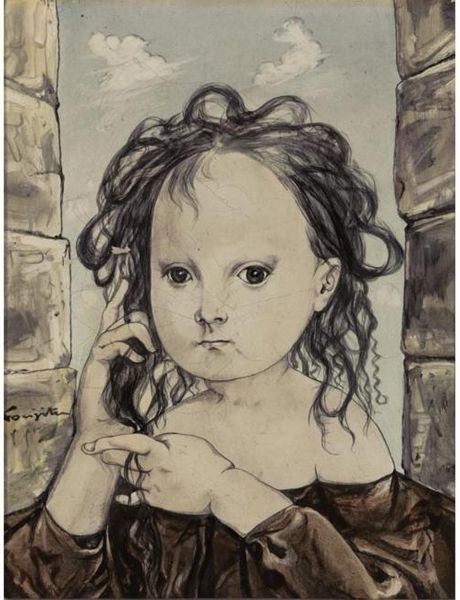 Editor: This is "Fillette à la poupée japonaise," painted by Tsuguharu Foujita in 1949. The medium appears to be paint. I’m immediately drawn to the contrast between the almost photorealistic rendering of the girl’s face and hair versus the doll’s simplified features. How do you interpret this work? Curator: The visual strategy employed by Foujita relies heavily on line and the tonal modelling to define form. Notice the subtle gradations that render the girl's complexion, achieving a porcelain-like effect. Contrast this with the stark, almost graphic, representation of the Japanese doll. Do you observe how this juxtaposition impacts your understanding? Editor: I do. The doll seems to flatten the image, as opposed to creating the depth the girl suggests. It’s as if they exist in different dimensions. Curator: Precisely. The interplay of textures is significant. Consider the treatment of the girl's hair—detailed and flowing—against the relatively flat planes that construct the doll’s form. Furthermore, examine the compositional choices—the off-center placement, the soft color palette. How does that frame of the artwork itself speak to the composition of what is displayed inside of it? Editor: Interesting point. The simple frame adds to the doll’s simplicity and helps balance it. What have I learned today? Curator: Yes, you learned how an examination of contrasting artistic styles and their visual effects can lead to deeper interpretive understanding. What strikes me about your examination of the piece is the interplay of art styles creating tension through conflicting elements within the piece.