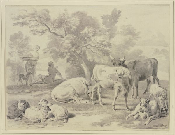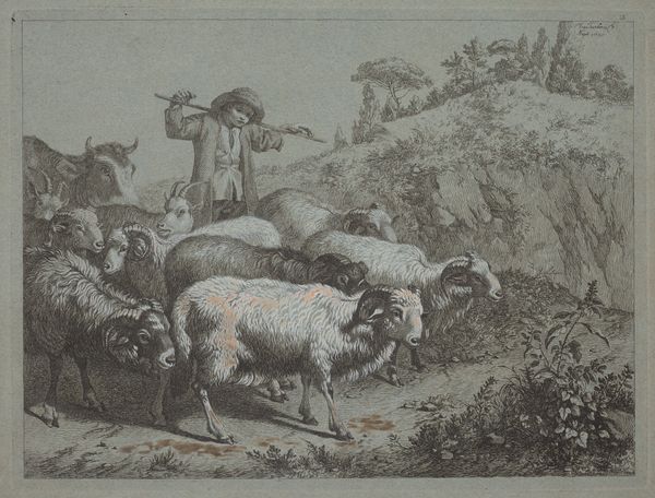Curator: This is Francesco Londonio’s “Boy on a Donkey Watching over a Group of Animals,” an etching from 1763. Editor: It’s surprisingly gentle. All these sheep, the languid cow… they seem content under the gaze of this nonchalant kid on his donkey. There is no feeling of being surveilled, of someone doing hard labor. Curator: Precisely! The picturesque pastoral scene was popular in academic art, recalling the perceived simpler life. The animals form a community. Notice how the soft shading suggests the warmth of the day. Londonio captured this rural idyll as if frozen in time. Yet… Editor: …there is perhaps an underlying issue of class and control. The boy on the donkey, elevated and separated, oversees this collection of beings. He, regardless of his own humble position in the broader social strata, exercises control here. Curator: Yes, though Londonio certainly wasn't aiming for radical commentary. It's subtle. The boy's almost merging into the donkey as if he becomes another animal; or an elevated beast of burden! We, however, tend to look back and, after scrutinizing such genre scenes, question this alleged tranquility. I'm curious… do you find something lost in such retrospective analyses? Editor: Well, there’s an inherent risk of anachronism, certainly, but dismissing socio-economic readings feels… tone deaf. Especially when depictions of peasants and working-class people were often romanticized to veil exploitation. This piece reminds me how so many of these genre paintings sanitize the harsher realities of pre-industrial life. The beauty masks underlying hierarchies. Curator: Perhaps! Or it might suggest something as basic as shared warmth. As if we become like each other when the sun beats down like this. You've nudged me towards an ambivalence that deepens my curiosity towards this era in general. Editor: Indeed! The simplicity feels so complex the more we analyze the landscape.