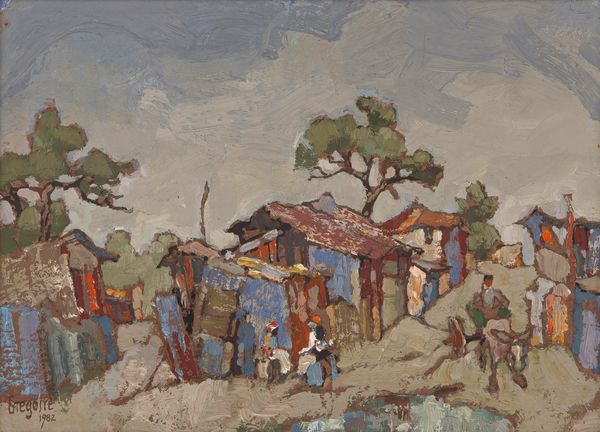 Curator: What a turbulent, expressive landscape. I am immediately struck by the layering of the paint and the texture throughout the composition. Editor: Indeed, the title "A Windy Day" seems perfectly apt. This is a painting attributed to Gregoire Boonzaier; while the exact date of its creation is not known, the materials involved included impasto oil paint on what seems to be canvas. Curator: That impasto technique is key here, I think. Notice how Boonzaier has applied the paint so thickly, building up the surface to create almost a sculptural effect. It emphasizes the raw materiality of the medium, lending itself to that kind of impressionist landscape aesthetic. One could spend an age thinking about Boonzaier’s engagement with tools. Editor: Looking at the history of landscape painting in South Africa, particularly during periods of social and political change, it's clear that depictions of the land often served as vehicles for expressing ideas about identity, belonging, and resistance. How do you think this piece intersects with this context? Curator: The materiality could provide insights into these social issues and movements through which Boonzaier navigated and it is easy to become trapped in the artist as a person. Maybe a question about the distribution, how many are accessible? Editor: I suppose there is always tension when artwork is a medium that the population can see or connect with, yet access may be unevenly distributed. I think one can say that such artwork embodies an element of resistance regardless. It presents a window of thought that can affect many and can change the socio-political landscape on micro and macro levels. But, coming back to the topic, the thick layering speaks to something deeper in terms of labour as a concept within art. Curator: Exactly, let’s continue in that thought as the history may illuminate our experience through this viewing today. Thank you. Editor: My pleasure. It is, undoubtedly, a powerful example of the social and historical weight art carries, as well as an appeal for more equitable distribution of artwork to further socio-political change in modern society.