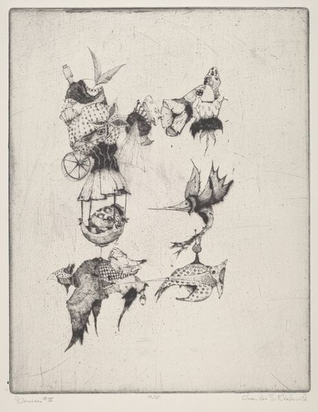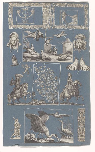 Editor: Here we have Joseph Cornell’s *Habitat Group for a Shooting Gallery,* from 1943, a mixed-media assemblage in a box. It has such a whimsical, yet melancholy feel to it. The antique bird images are really evocative. How do you interpret this work? Curator: For me, this piece reverberates with cultural memory and hidden narratives. The birds themselves, fragmented and numbered like specimens, evoke a sense of loss, a displaced paradise perhaps. Consider the 'shooting gallery' in the title – it implies a game, but also violence, a threat to these fragile creatures. Cornell was deeply affected by personal anxieties and global events, specifically war. Editor: That's interesting, I was focused on the colourful birds, not their fragility. The numbered tags...are those significant? Curator: Yes, the tags and printed ephemera layered within the box—hints of Parisian commerce and exotic locales—are like clues scattered across time. They represent the romantic allure of travel, but also the cold precision of categorization, of control. The collage background feels very distant and artificial. Do you notice the way he creates a world within a world? Editor: Absolutely, a stage set almost, for something bittersweet. So, it's a commentary on longing and maybe the precarity of beauty? Curator: Precisely. It makes me think about lost paradises or fleeting moments. Consider that even our fascination, our human impulse to possess or to categorize can actually harm what we admire. What’s your sense now, looking again? Editor: I see it! Before I saw a cute box, but now the layered textures make it seem deeper. More like a commentary on both human intervention and cultural displacement of nature itself. Cornell really loaded this box with meaning!