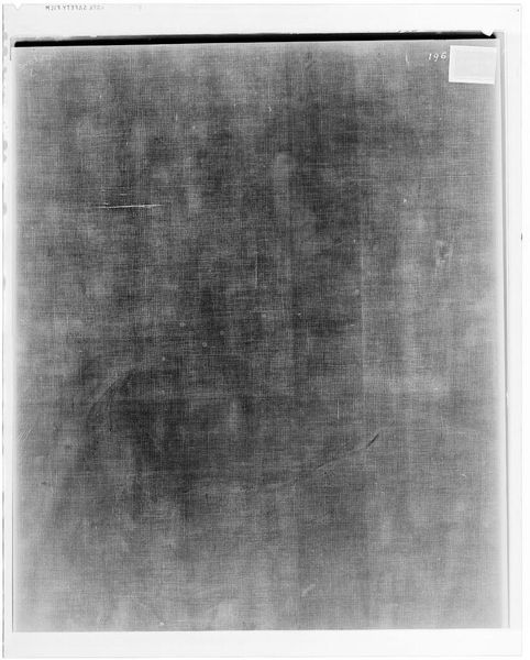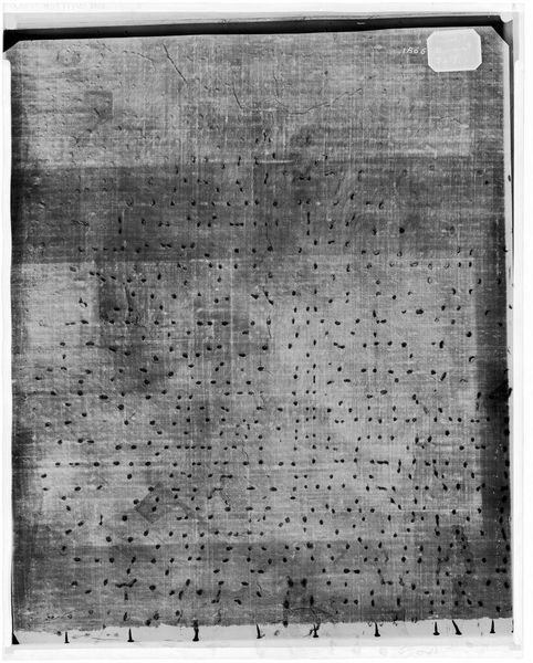 Curator: Here we have an X-radiograph of "Male Portrait," attributed to Giovanni Girolamo Savoldo, part of the Harvard Art Museums collection. Editor: It’s fascinating – a ghost of an image. The canvas texture is so prominent, almost like a woven grid. Curator: Indeed. X-radiography allows conservators to peer beneath the surface, revealing the artist's process and any hidden layers. It's a critical tool for understanding the painting's history. Editor: Look at the dark splatters, they're almost abstract against the more regular pattern. Do they show alterations or damage? Curator: Likely both. Conservation often leaves its mark. These details tell a story about the painting's life, its journey through time and various hands. Editor: It's like looking at a negative, a shadow of what once was, and a hint of what might still be. Curator: Precisely. It's a unique perspective on the relationship between art, science, and the public trust.