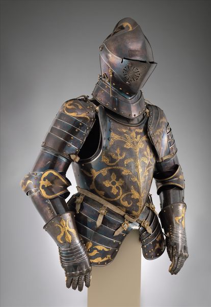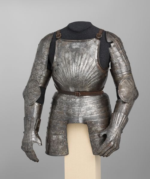 This half armor, crafted by an anonymous maker, is a testament to the remarkable skills of metalworkers. Primarily forged from steel, the armor's surface is intricately etched with decorative patterns. Look closely, and you'll notice the attention to detail, from the fluting that strengthens the plates to the small, gilded rivets. The material itself is paramount here; steel, chosen for its strength and malleability, could be worked to deflect blows while also being shaped to fit the wearer's body. Consider the sheer labor involved in creating such an object. The armorer had to be a master of many techniques: forging, filing, polishing, and etching. Armor like this wasn't just protection; it was a statement of wealth and status. The amount of work embedded in the object signaled the importance of its wearer. Ultimately, this half armor sits at the intersection of craft, design, and social history, reminding us that even functional objects can be powerful cultural artifacts.