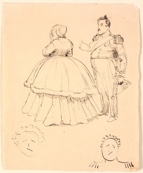 This caricature of Johan Michaël Schmidt Crans, dating back to 1863, captures a peculiar moment with sharp lines. The eye is drawn to the fan held by the woman to the left, emblazoned with ‘Ongeloof’ and ‘Evolutie’. The fan, historically a symbol of coquetry and hidden messages, here becomes a tool of ideological expression. The words suggest the tension between religious dogma and evolving scientific thought. Consider how the 'wheel of fortune' or 'rota Fortunae' appears in medieval art – a similar circular motif symbolizing the capricious nature of fate and change. In this image, however, it represents an intellectual challenge to established beliefs. The juxtaposition of the woman’s theatrical pose and the man presenting a document labeled 'Opportuniteit' reveals a deeper conflict: the clash between entrenched conservatism and emerging liberal ideals. The artist taps into a collective anxiety about societal transformation, engaging us on a visceral level with the emotional and intellectual turmoil of the era. This symbol recurs throughout history as the constant dance between belief and progress.
