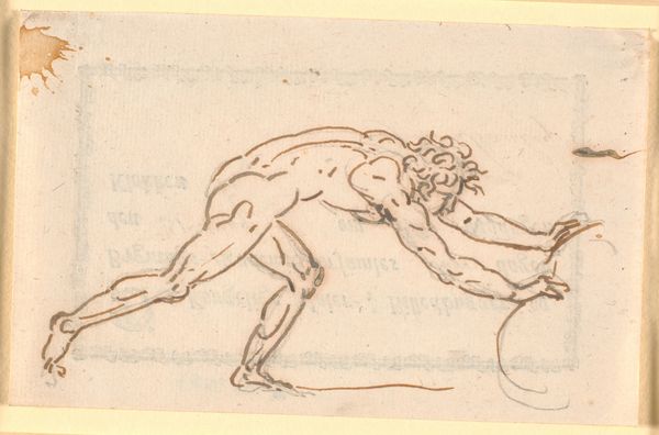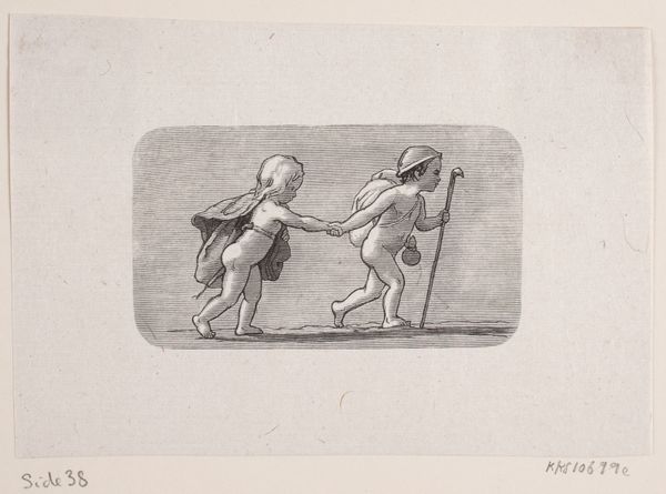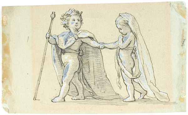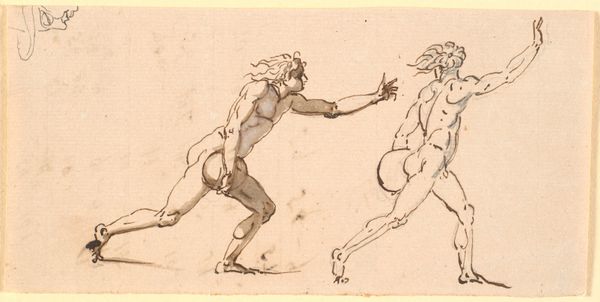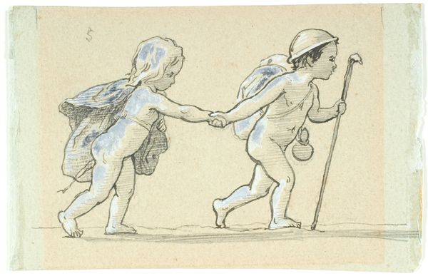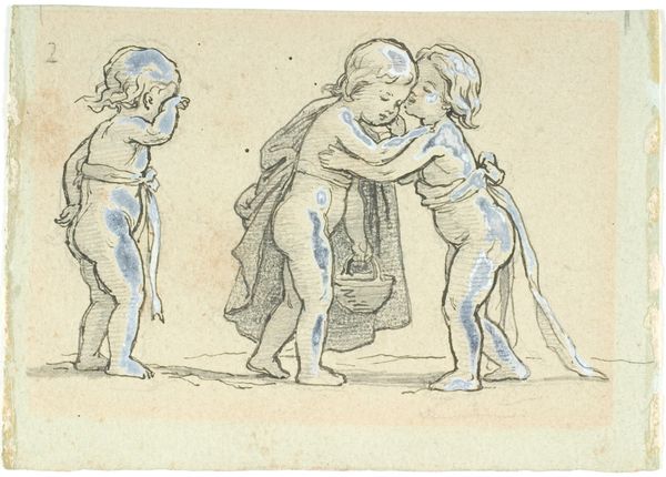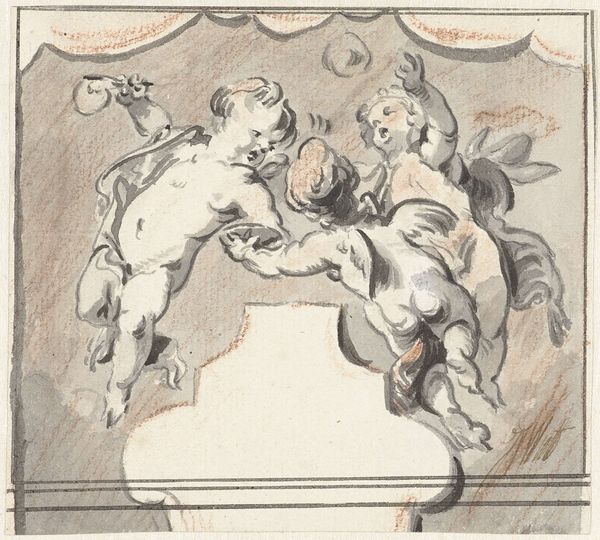 Lorenz Frølich created this small drawing of two fighting children using pen and ink. The figures stand out against the vignette's minimal backdrop, the naked cherubic boys rendered with expressive lines and delicate shading. The dynamism of the scene, their gestures frozen mid-tussle, is palpable, evoking a sense of playful yet aggressive energy. Frølich here engages with a classical motif but infuses it with a raw, almost unsettling realism. The cherubs, typically symbols of innocence and love, are depicted in a moment of conflict, challenging conventional notions of childhood purity. The stark contrast between the idealized form and the chaotic action creates a tension that invites deeper interpretation. The drawing's strength lies in its ability to destabilize established meanings. Frølich uses a familiar visual language to explore more complex themes of aggression and power. The vignette prompts reflection on the contradictions inherent in human nature, where the sacred and the profane, the innocent and the violent, coexist.