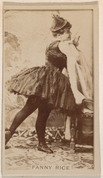 Editor: Here we have an 1880s print of Daisy Murdoch, "Card Number 85" from the Actors and Actresses series, made to promote Cross Cut Cigarettes. It feels like a very posed photograph that has been reproduced. What strikes you most about this image? Curator: Immediately, the intersection of celebrity, advertising, and tobacco grabs my attention. These cards, inserted into cigarette packs, reveal a lot about the social role of art and imagery in the late 19th century. Consider how the emerging mass culture relied on the popularity of actresses like Murdoch to sell products and associate them with sophistication and allure. The context shifts our understanding of the artwork itself, doesn't it? Editor: It definitely does. So, was it common to use performers to market products? Curator: Absolutely. This type of celebrity endorsement was prevalent and reveals the symbiotic relationship between the entertainment industry, the emerging consumer culture, and advertising. The imagery was often carefully curated to project ideals of beauty and success onto the product. What does the staging suggest about that here? Editor: She’s holding what looks like a chalice, and there's this quasi-classical background... It's like they're trying to give an ordinary cigarette brand some kind of prestige. But knowing it's advertising sort of cheapens it somehow, right? Curator: The act of elevating the mundane – like cigarettes – to a level of high culture or artistic merit through such imagery. Consider then the potential manipulative power that images could exert on a public audience and the role such ephemera played in constructing desire. Now, reflecting on it, does knowing all of this alter how you perceive Daisy Murdoch, and maybe even her agency as a performer? Editor: I think so, because it forces us to consider the actress herself as a commodity, almost secondary to what she’s advertising. Curator: Precisely. It pushes us to question who truly benefits from this sort of artistic production. Editor: Definitely something to consider. I didn't realize how complex something seemingly so simple could be.