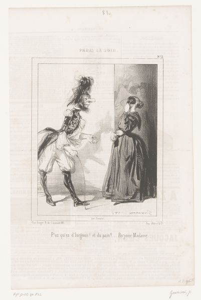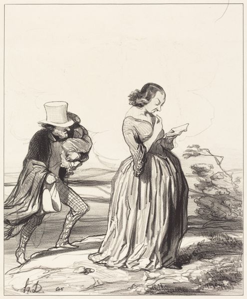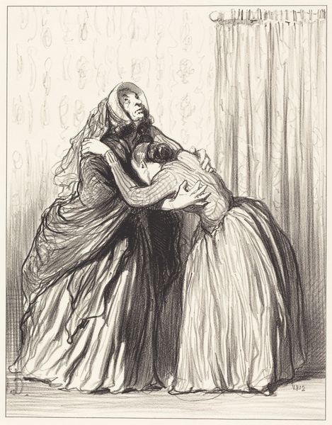 This lithograph was made by Honoré Daumier in France, likely in 1840, and is titled “A bon chat bon rat”. The print depicts two women engaged in a physical fight. Daumier was renowned for his satirical commentary on French society. The proverb, "A good cat, a good rat," suggests a tit-for-tat exchange or a conflict where both parties are equally matched. This image would have been distributed through the popular press, and it speaks to the social tensions of the time, perhaps reflecting the struggles and rivalries within the emerging middle class. Daumier often used his art to critique the bourgeoisie, and this print may be a commentary on their values and behaviors. To understand this work more fully, we could research the role of women in 19th-century French society, the prevailing social mores, and the ways in which popular media shaped public opinion. Understanding these connections is vital to uncovering the social meaning embedded in this seemingly simple image.