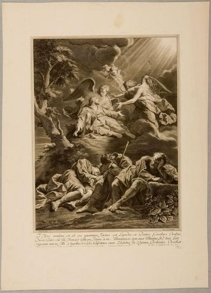 This print of the Four Evangelists was made by Gilliam van der Gouwen, probably in the early 18th century. It’s a small work, made through the labor-intensive process of engraving. Look closely, and you'll see how van der Gouwen used precise cuts into a metal plate to create this intricate scene. The varying depths and densities of lines, all achieved manually, give form to the figures and create a sense of depth. The social context of printmaking is crucial here. It was a key technology for disseminating information and imagery widely. This print would have been part of a larger system of production, with workshops full of skilled artisans replicating images for a broad public. The visual qualities, from the serene expressions of the Evangelists to the dramatic light effects, are direct results of this meticulous process. It's a testament to the engraver's skill and the cultural importance of printmaking at the time. By appreciating the material and the making, we move beyond just the religious subject, and understand the wider world of labor, skill, and distribution that the print embodies.
