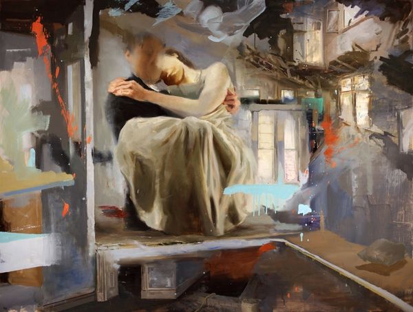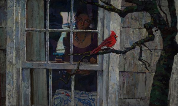 Vicente Romero painted “Rainy Day”, and it presents a study in contrasts, framing a woman indoors with a vibrant yet muted scene outside. The intense blue of the window frame anchors the composition, creating a structural division between the soft, diffused light on the woman’s face and the blurred shapes visible through the rain-streaked glass. Romero masterfully employs a semiotic interplay of light and shadow. The woman’s closed eyes and serene expression offer a moment of introspection, highlighted by the gentle illumination. In contrast, the exterior is impressionistic, with the blurred forms of flowers and a distant warm glow suggesting a world continuing beyond the window. This use of framing destabilizes the conventional boundaries between interior and exterior, observer and observed. The window itself acts as a signifier, inviting us to consider the blurred line between subjective experience and the objective world outside. It is in this liminal space, that Romero invites ongoing interpretation.