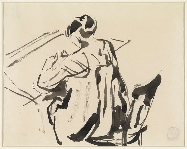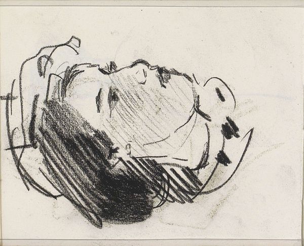 Editor: Here we have Leo Gestel's "Vignet voor boek 'L'art Hollandais contemporain' van Paul Fierens; liggend vrouwenhoofd," created between 1932 and 1933 using ink. The stark black and white creates a striking image. What do you see in this piece from a materialist perspective? Curator: From a materialist lens, I immediately consider the starkness of the ink – its availability and cost during the interwar period. Gestel's rapid, almost crude application de-emphasizes traditional skill, turning our attention to the very act of creation and its means. How does this rejection of refined technique speak to the art market's changing values during this time? Editor: I see how it disrupts traditional ideas of artistry by highlighting the process over a polished final product. Did this reflect any societal shift regarding labor or consumption? Curator: Absolutely. This simplification mirrors the burgeoning industrial aesthetic – valuing efficiency and mass production over individual craftsmanship. Ink, easily reproducible, symbolizes this shift away from unique, precious materials. The very title – "Vignet voor boek" – frames it as a utilitarian object. Does this impact how you view its artistic merit? Editor: It does make me reconsider its initial function as a means to sell and distribute an idea about art rather than an aesthetic end in itself. I see that connection between art, commodity, and social forces more clearly now. Curator: Exactly. By focusing on the raw materials and the mode of production, we reveal how even a seemingly simple portrait is deeply embedded within its socio-economic context. It forces us to confront what labor produces art. Editor: This has given me a new perspective. Thanks for showing me the role material choices play. Curator: And I am reminded to always ask who gets to make art and under what conditions.