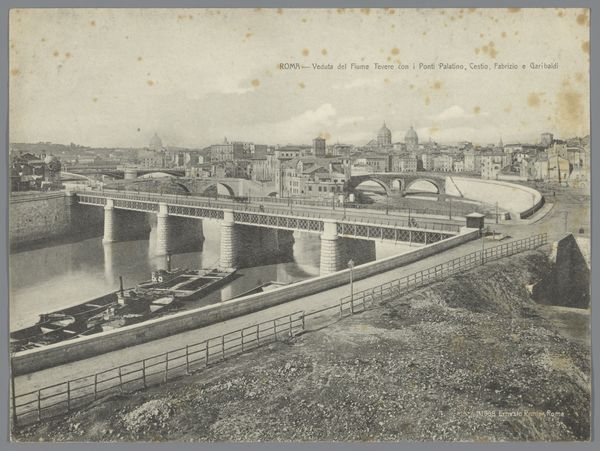 Editor: Here we have Edouard Baldus’ "Tarascon, Viaduc," an albumen print from the early 1860s. There’s a remarkable stillness to it, the tones all soft browns and greys. The composition is clearly divided, with this imposing bridge set against a carefully cultivated foreground. How do you interpret this work, especially focusing on the formal elements? Curator: A fascinating study in structure. The bridge, with its repeating arches, establishes a strong horizontal rhythm. Note how Baldus contrasts this regularity with the more organic forms in the foreground – the vegetation and the small building with its tiled roof. This interplay creates a visual tension. Consider also the tonal range. It's narrow, almost monochromatic, but within that limitation, Baldus achieves a remarkable differentiation of textures. What strikes you about the light in the photograph? Editor: It seems almost uniformly distributed, lacking strong shadows. Does that flatten the image or enhance its sense of distance and depth? Curator: That diffusion enhances the overall pictorial depth. Baldus isn't striving for dramatic contrasts. Instead, he emphasizes a measured observation of the scene. Look carefully at the collotype texture too; does the mechanical application add to the perceived depth? Editor: That’s really insightful. Focusing on these visual relationships makes the image so much more complex. Thank you. Curator: Indeed, analysing the structure of an artwork such as "Tarascon, Viaduc," and then understanding how the different layers of materials operate is invaluable for better appreciation.